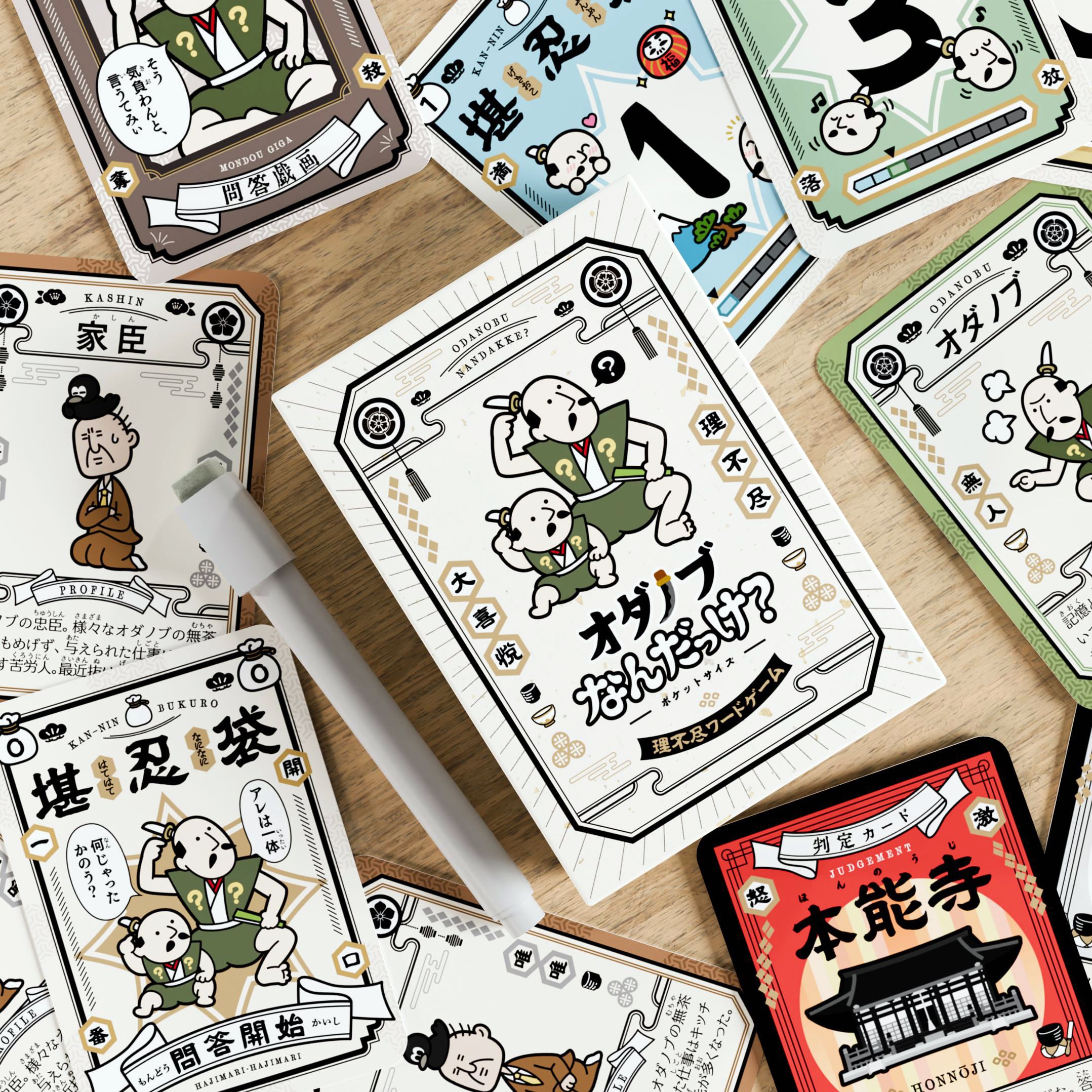 内容は、ヒリつく緊張感がたまらない「理不尽モード」と、気楽に小さなお子様と一緒に遊べる「ごきげんモード」の2つ。アナログゲームならではの楽しい時間を、「オダノブなんだっけ? ポケットサイズ」にぎゅぎゅっと詰め込みました。